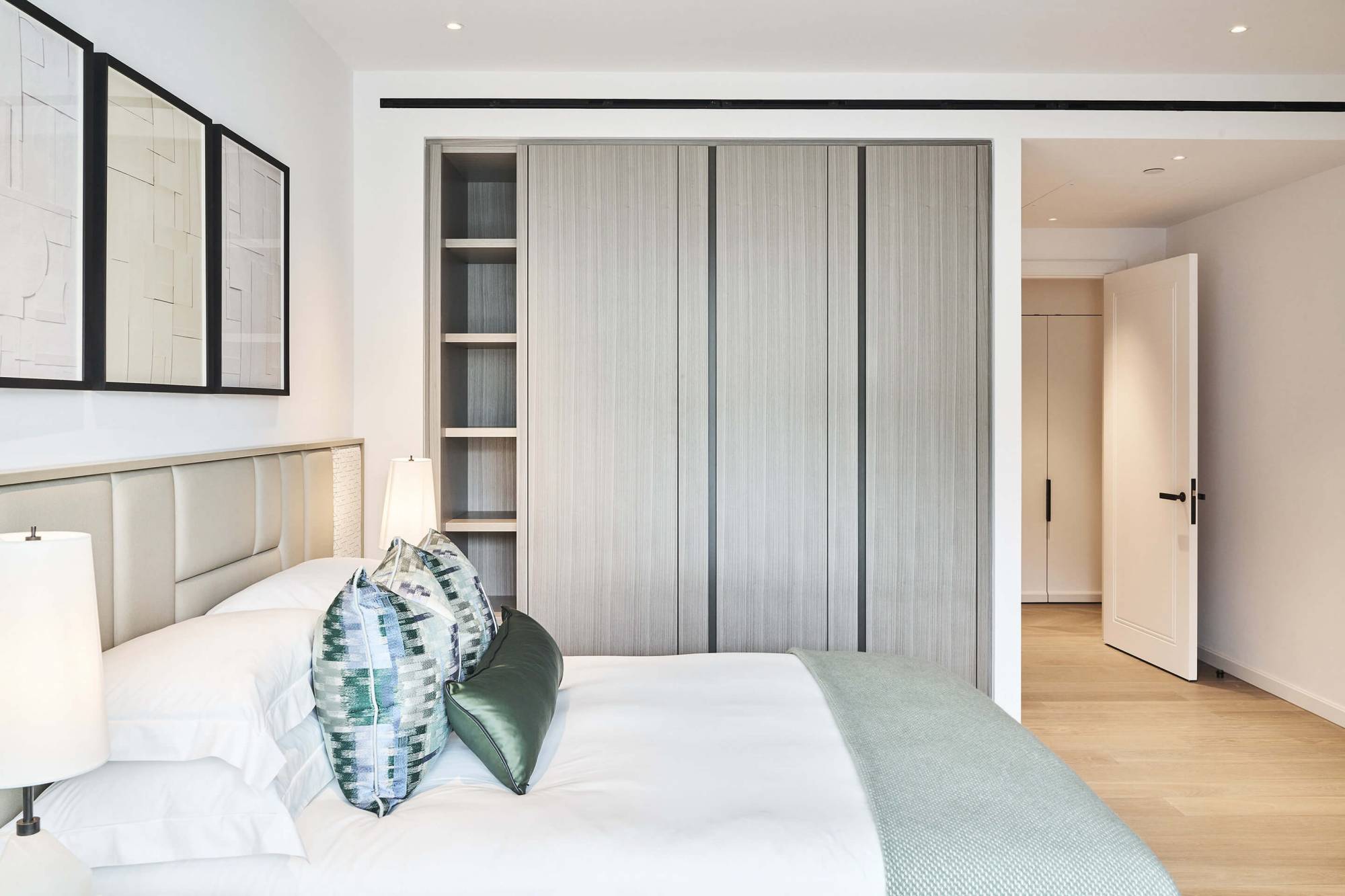 Pensé pour s’intégrer harmonieusement à l’espace, ce dressing ouvert privilégie la liberté et la fluidité d’usage. L’absence de portes renforce la sensation d’un lieu aérien, contemporain et apaisant, où chaque vêtement trouve naturellement sa place.